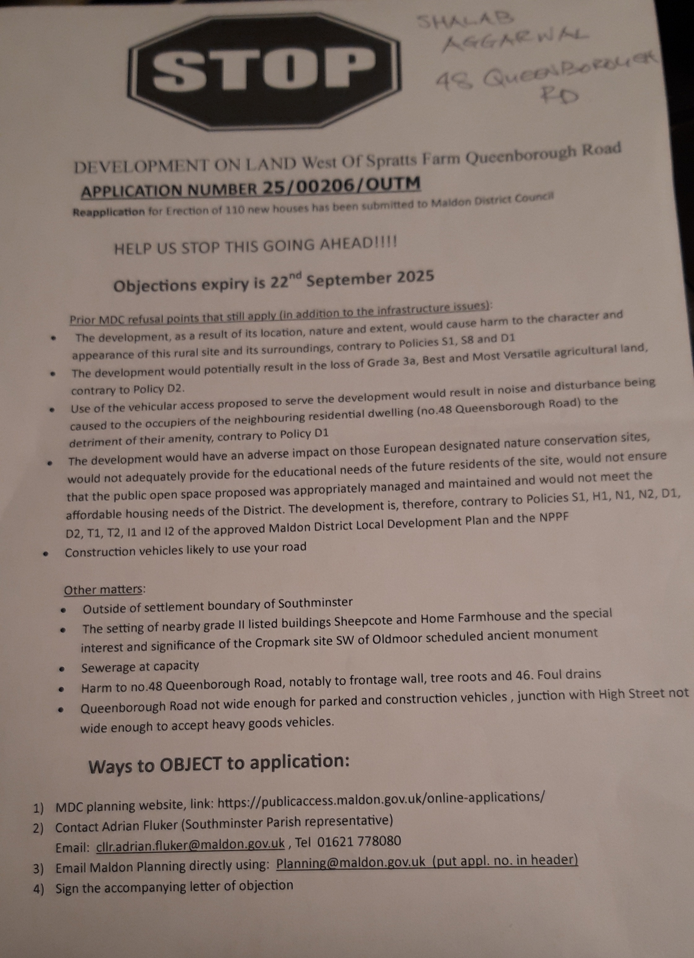 A leaflet with information about Maldon District Council Land Development application 25/00206/OUTM - with information about prior objections and advice on how to object.